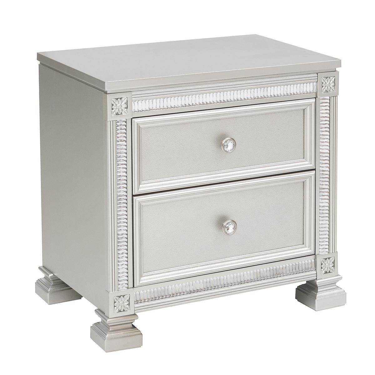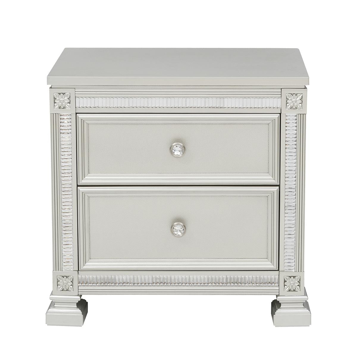 The Calibria Nightstand brings bold sophistication to your bedside, combining radiant crystal accents with a sleek silver finish.